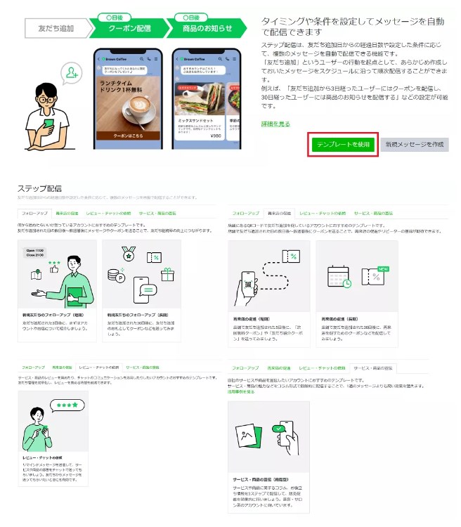 この機能を使うことで、顧客がビジネスを忘れないように定期的に接触を図ることができ、さらにステップごとに異なるオファーや情報を届けることで、自然とリピーター化を促進できます。ステップメッセージは、設定さえすれば自動で運用できるため、効率的な顧客フォローが可能になります。