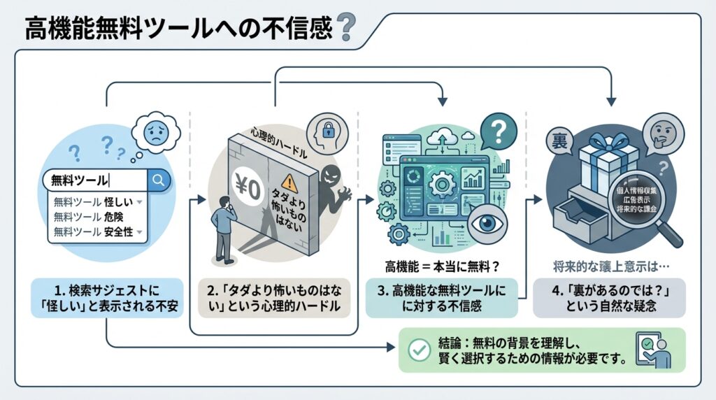 「プロラインフリー」と検索すると、サジェストに「怪しい」と出てきて不安になったことはありませんか? 「タダより怖いものはない」と言う言葉がある通り、高機能なツールが無料だと逆に裏があるのでは…と勘ぐってしまうのは当然です。