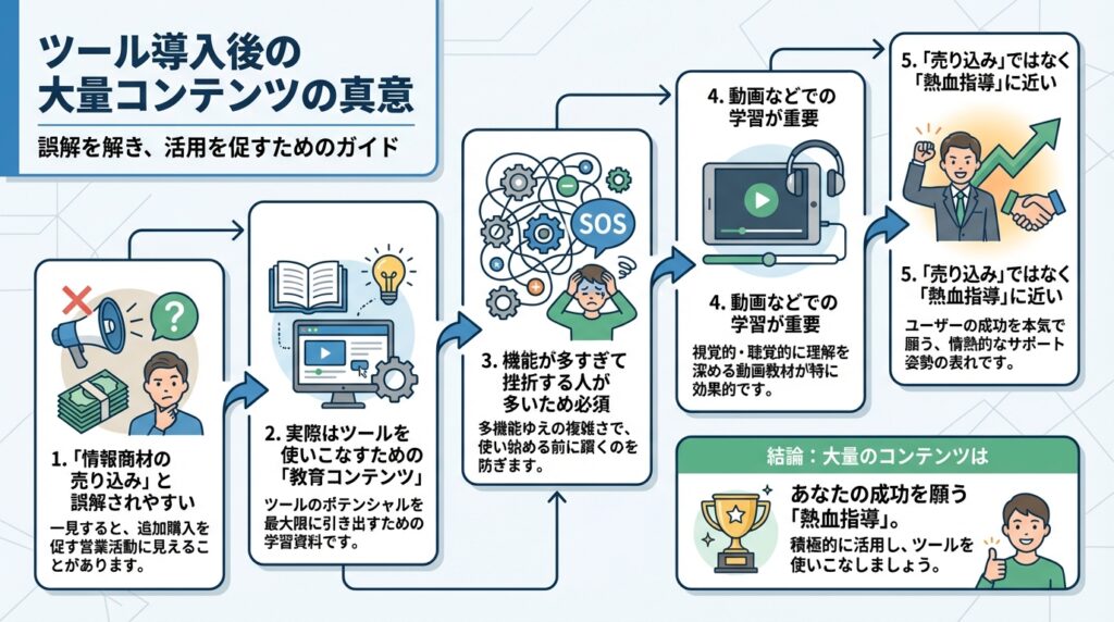 アカウントを作ると、大量の解説動画やメールが届きます。これが「情報商材の売り込みみたいで怖い」と感じる人がいます。 実際のところ、これは「ツールを使いこなしてもらうための教育コンテンツ」です。機能が多すぎるため、動画で学習しないと挫折する人が多いのです。 「売り込み」というよりは「熱血指導」に近いと考えてください。