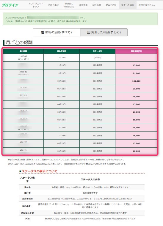 既に有料プランを契約しているユーザーを紹介した場合でも、報酬が発生します。これは継続利用を促すための報酬であり、ユーザーが長期的にプロラインフリーを活用するようサポートすることが重要です。