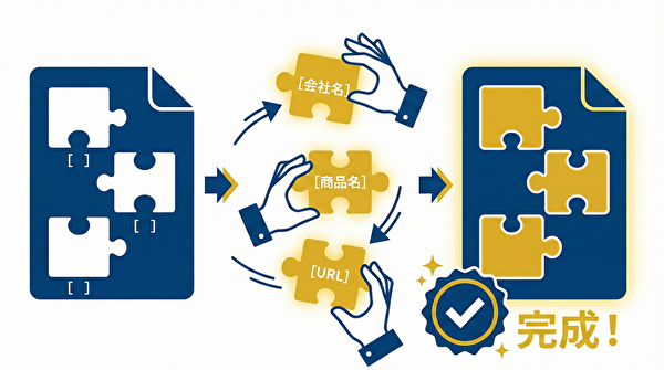 あなたがやることは、テンプレート内の[ ](ブラケット)で囲まれた部分を書き換えるだけです。
