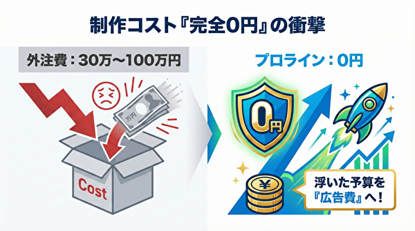 通常、まともなLPを外注すれば30万〜100万円は下りません。しかし、プロラインならフリープラン(無料)の範囲内でも、プロ顔負けのLPを作成・公開できます。浮いた外注費を広告費に回せば、それだけで競合よりも優位に立てます。